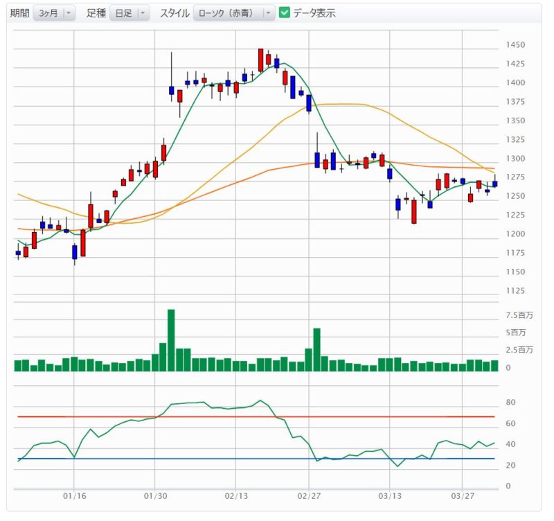 株価はRSIが80付近で横ばいになるまで上昇していましたが、2月中旬ごろから目標株価の引下げ発表が相次ぎ、株価は急落しました。